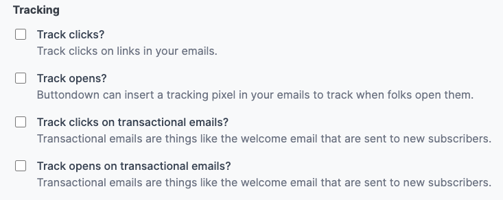 There are four "transactional" email that you can set the body content for on Buttondown. A transactional email is one that is send based on some action by a subscriber. These email are: