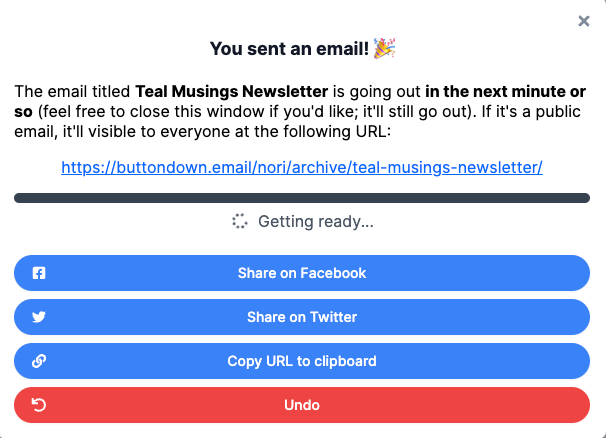 After sending an email, you have options offered to promote the newsletter on social email or share the link.
