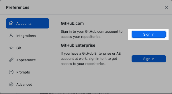 After downloading and installing, you need to authenticate it with your Github account. Open preferences, click on sign in. This will redirect you to your Github account from your default browser.