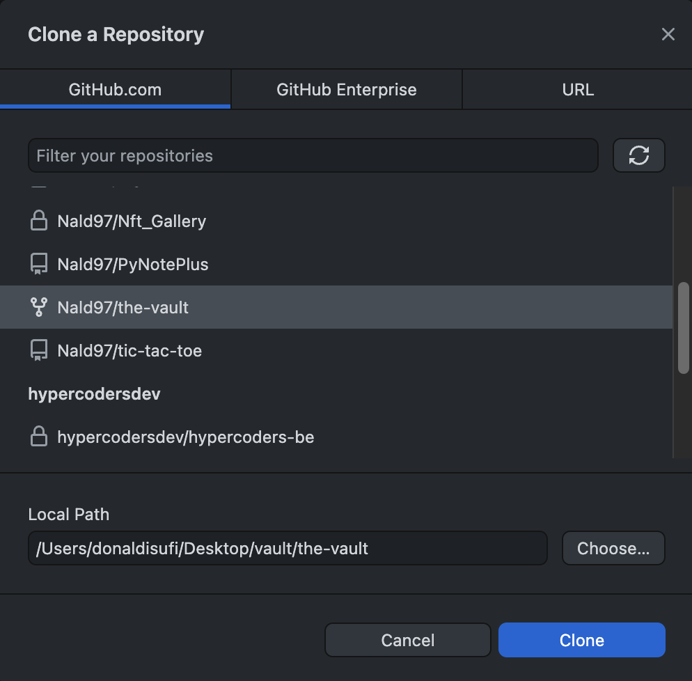 10. Same as in the step 2 in the part above, select `SSH` instead of `HTTPS` and copy the content. Go back to the terminal and type the following command `git clone git@github.com:*username*/the-vault.git`