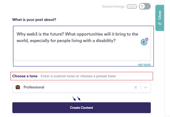 You can also select a pre-made template if you wish. To generate content with this tool, simply enter any topic "Why is web3 the future?" then, choose a tone, now hit the "Create Content Button." If you're not satisfied with the output, you can still create more copy, then save them.