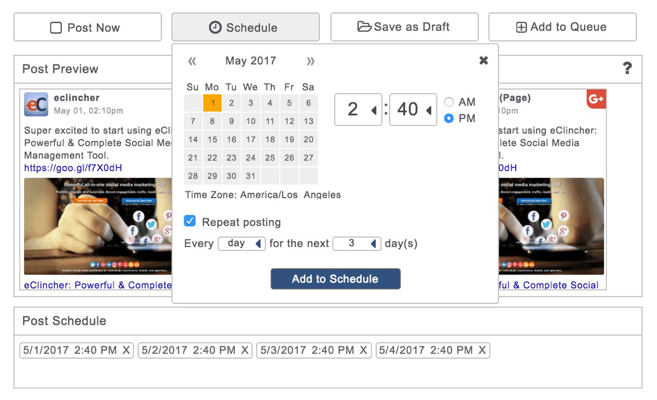 Schedule your written post for a specific time and day by using the calendar, once you've set the time and day, click on “Add to schedule.”