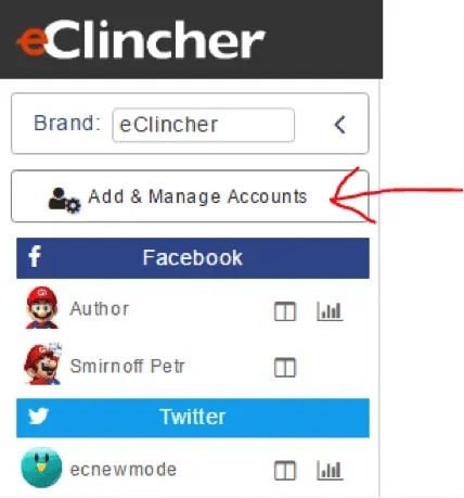 Firstly, connect your social media accounts to Eclincher. Click on Add and manage accounts as shown in the screenshot below. If you have more than one account on the same social media network, you'll need to log out first, then log in to your second account.
