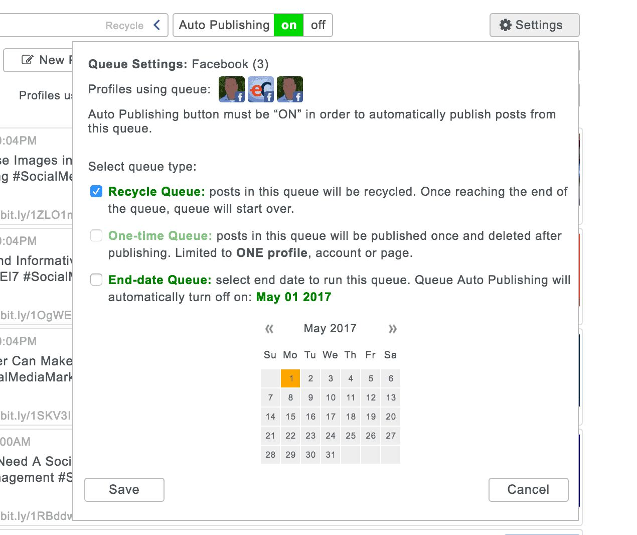 Another powerful feature on Eclincher is the “Auto Post Queues.” This allows queued content to be published automatically. It could be posted from your social profiles, pages, or groups. Select the social media channel because each platform has their own rules, post length, and post format. Hit “settings” to select the queue type, then save.