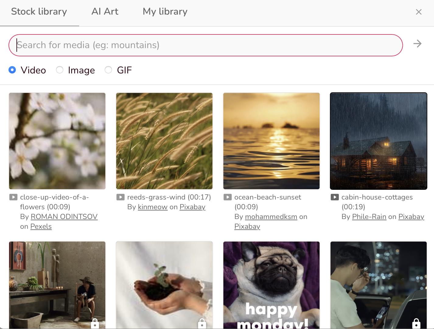 Here you have three options. Stock library of videos or images, AI-generated images, or your media.