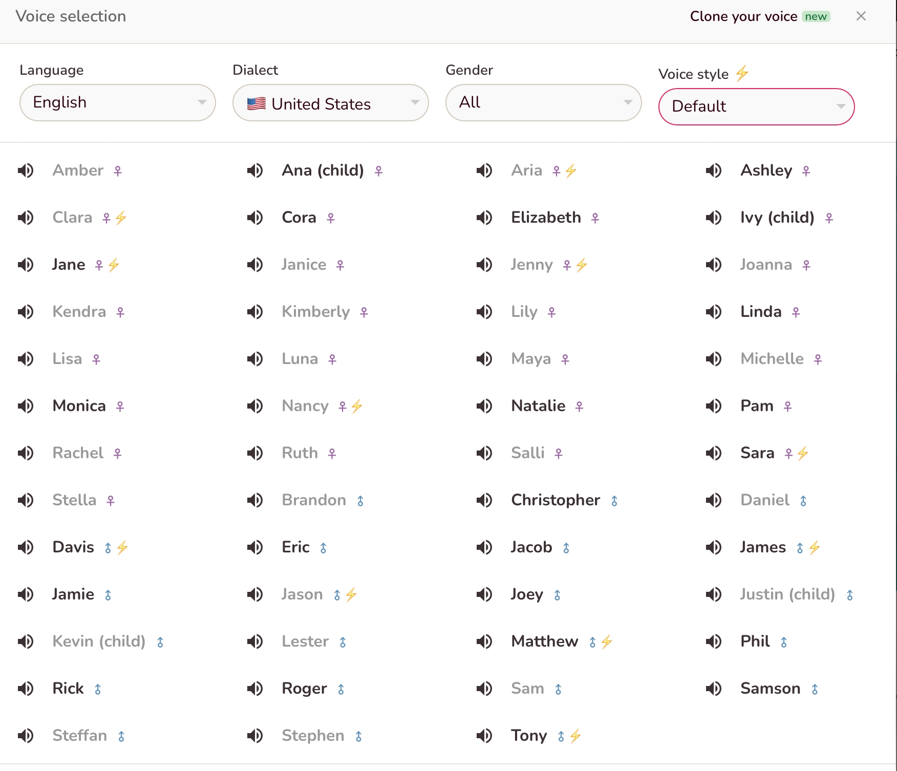 The voice selection is very rich. You can choose the language, dialect, and gender for your voice. Some languages even have child voices like American English.
