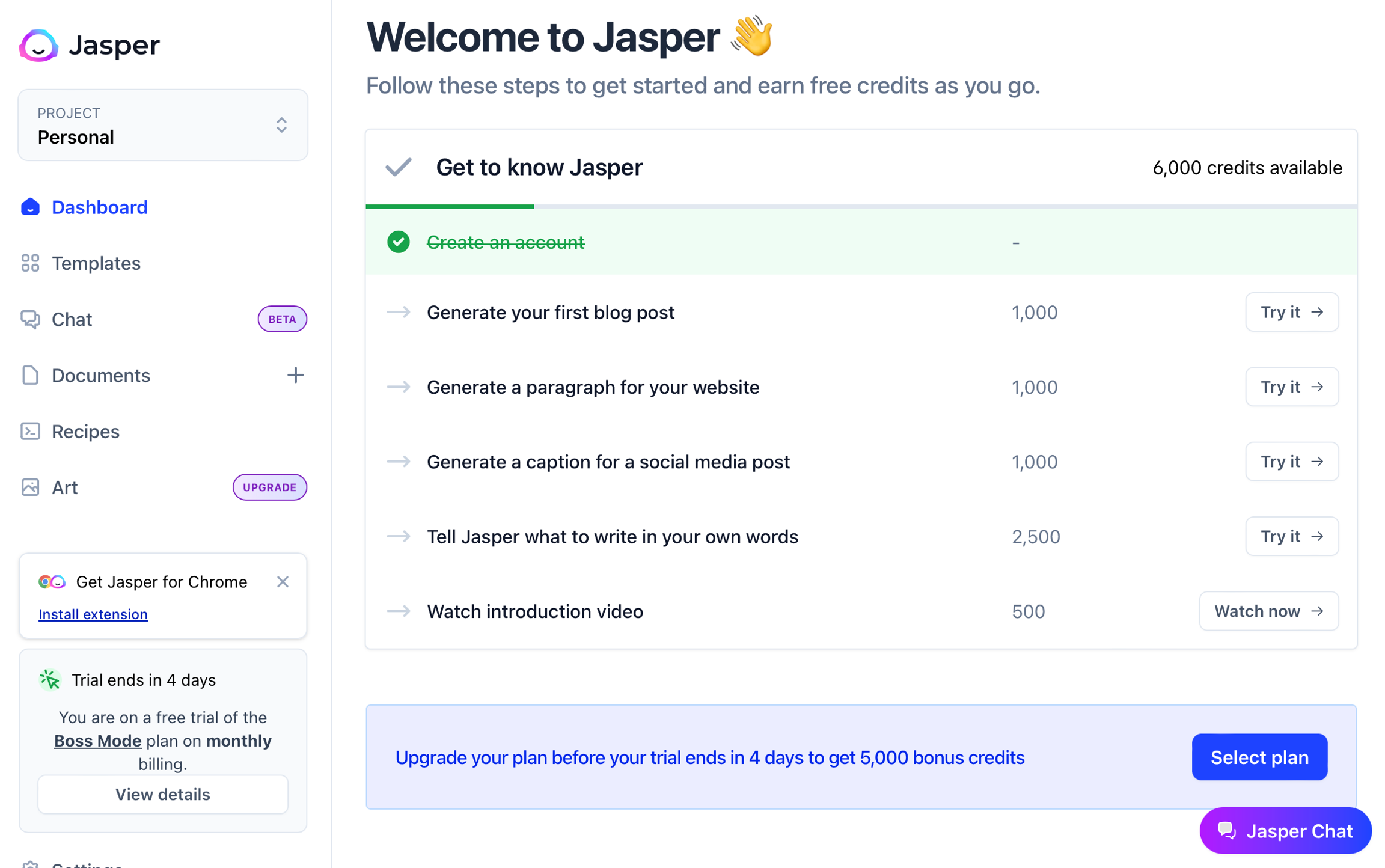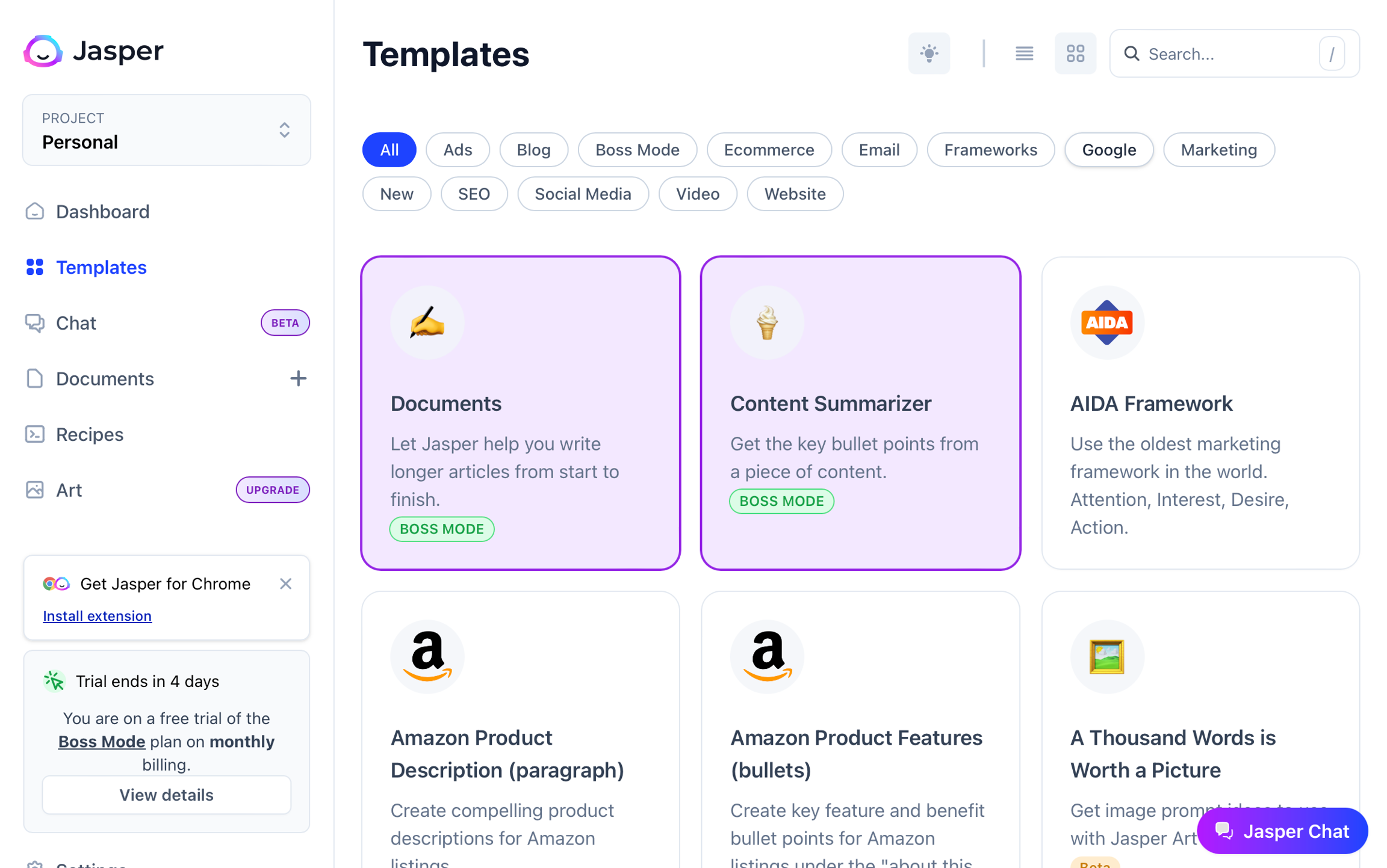 Jasper AI is a paid service but you can try it for free for five days and cancel the subscription with no fees. If you want to continue using it, the Boss Mode, which is like an individual version, starting price is 59 American dollars for 50,000 words per month and it can go up to 600 American dollars for 700,000 words. If you want even higher words per month, they offer custom pricing. The business version has a custom plan and pricing policy which requires the custormer to contact the Jasper team. There is also a chrome extension for Jasper.