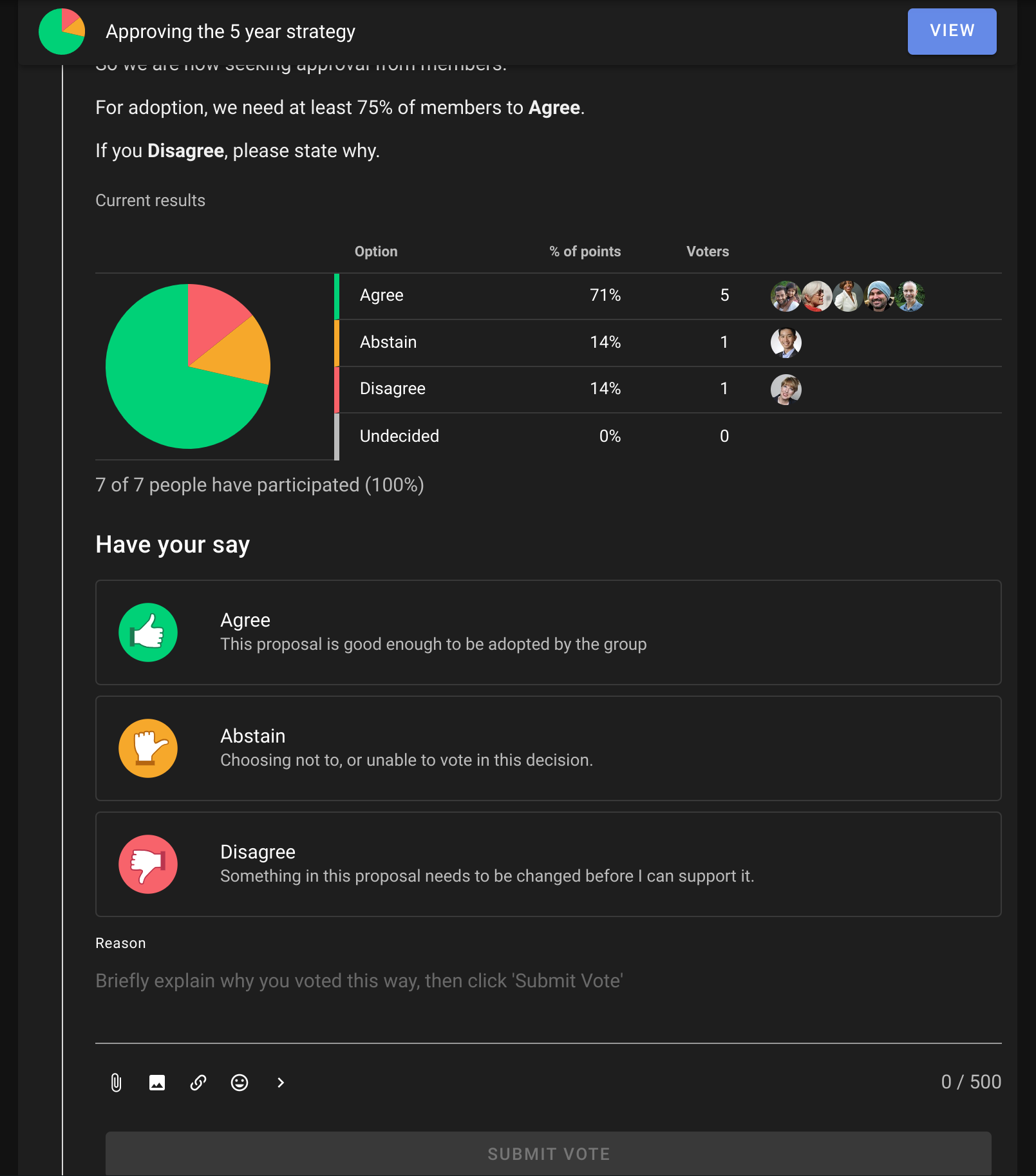 * **Proposal Mechanism**: Within discussions, members can put forward formal proposals. These proposals can be voted on, with various voting options available, from simple yes/no votes to more nuanced scales.