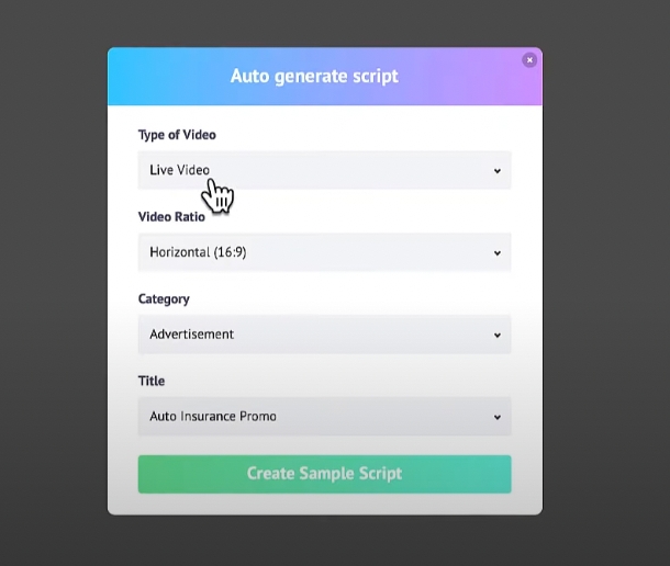 Upon clicking the Start button in Script to Live video, you will be prompted to provide specific characteristics for your desired video. The form displayed below is precisely where you should input these specifications.