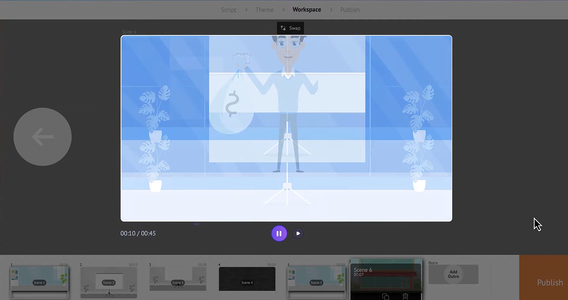 Finally, the next step is called the Workspace. In here the user can edit the generated video as they wish. After reaching a satisfying version, user should click on Publish button to finalize the process.