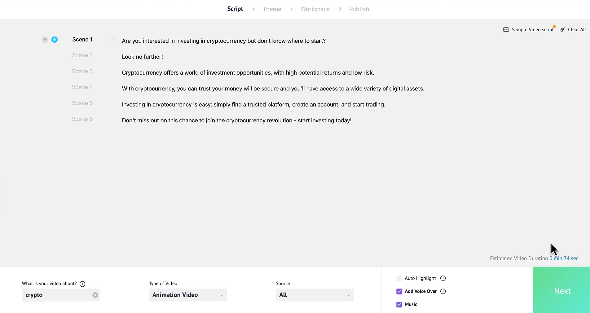 In the subsequent step, the user is required to input the script which outlines the content of the video. It is crucial to note that a prompt must be provided for each individual scene that the user envisions for the video. In the end of the screen the user may find some options such as to add Music, Voice Over or even Auto Highlight.