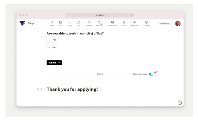 To create a custom “Thank you page,” use the toggle on top of your last page or type /thank. Whether you create a custom Thank you page or not, a default one will display at the end of your form.