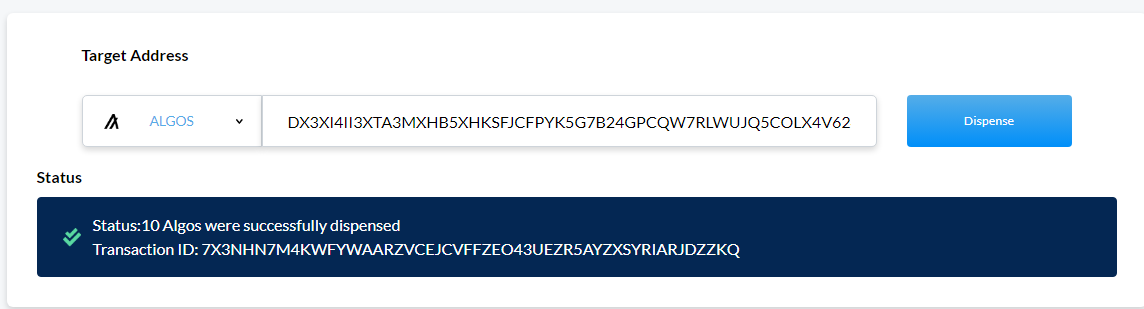 In other to interact with the Milkomeda Algorand Bridge, you should configure an Algorand wallet such as MyAlgo. Once you've successfully created your new wallet, you need to obtain Test ALGO. This will enable you to interact with the Bridge dApp. Visit the Test ALGO Explorer, paste your new created wallet address and click Dispense; you should be able to see some tALGO in your Algorand Testnet wallet.