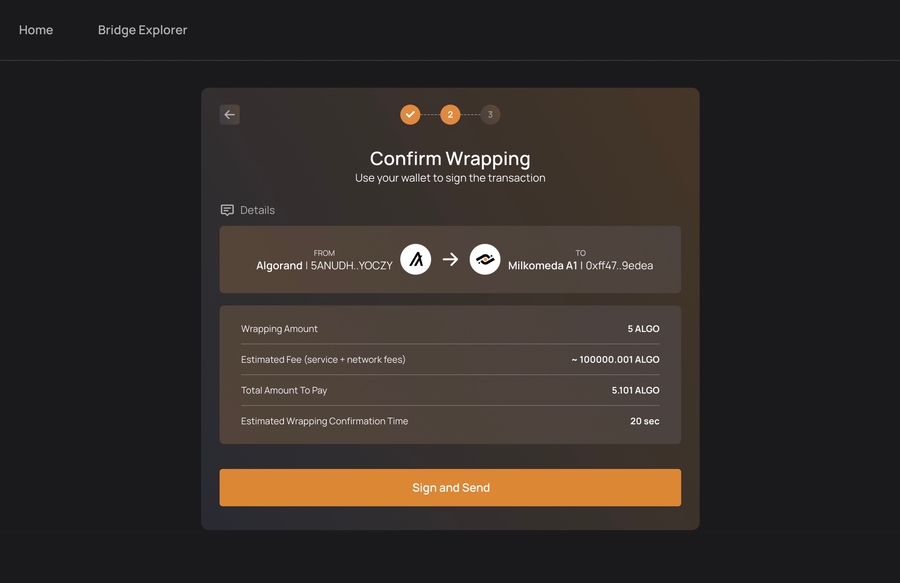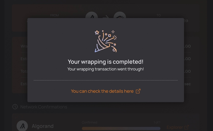 After the transfer is done, the Bridge submits a request to the target chain's smart contract for minting a wrapped version of the asset. Once the transaction is verified and confirmed, these wrapped asset (MilkAlgo) can be freely transferred and utilized on the target chain.