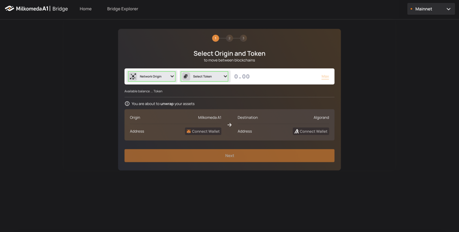 To start wrapping your assets, Select Algorand to Milkomeda from the "Network Origin" menu then choose the token you want to wrap. For example, ALGO.