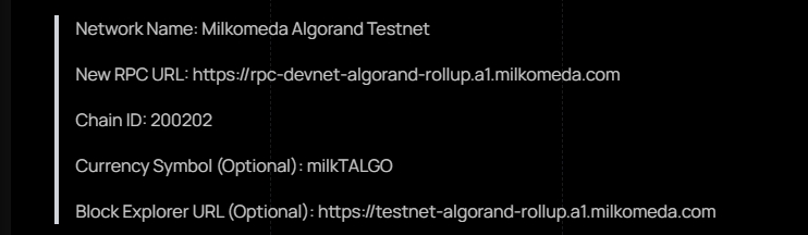 The Milkomeda A1 Rollups leverages MilkALGO as a base asesst for transaction fees and gas - to access this Rollup, users need a Algorand native wallet holding some $ALGO token, and MetaMask wallet as well.