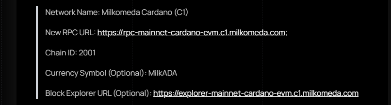 Moving forward, we need to get a wallet address on the Milkomeda C1 sidechain for receiving our MilkADA, we'll use MetaMask for this step.